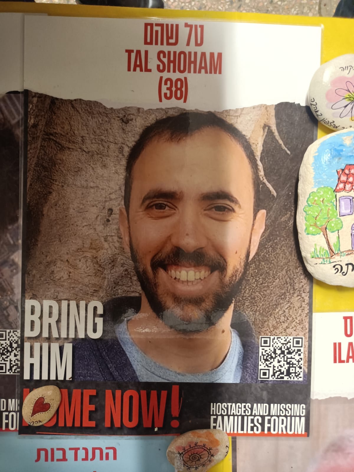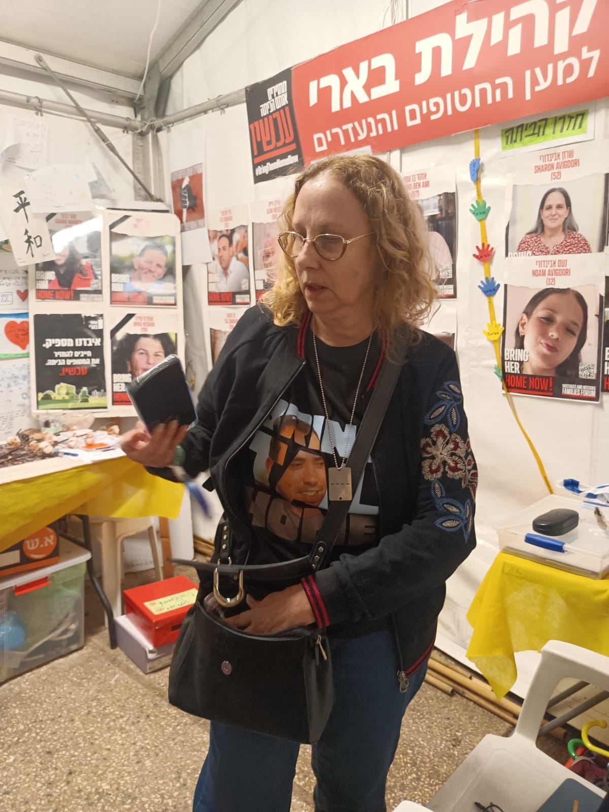 The weight of the emotional rollercoaster takes its toll on Nitza as she shows me a glimpse of Tal. Wearing the plea "BRING HIM HOME," her voice trembles with a palpable fragility, and it's evident that the journey into the harrowing details has drained her energy. In an act of self-preservation, she steps away, intending to bring her husband to continue the narrative.