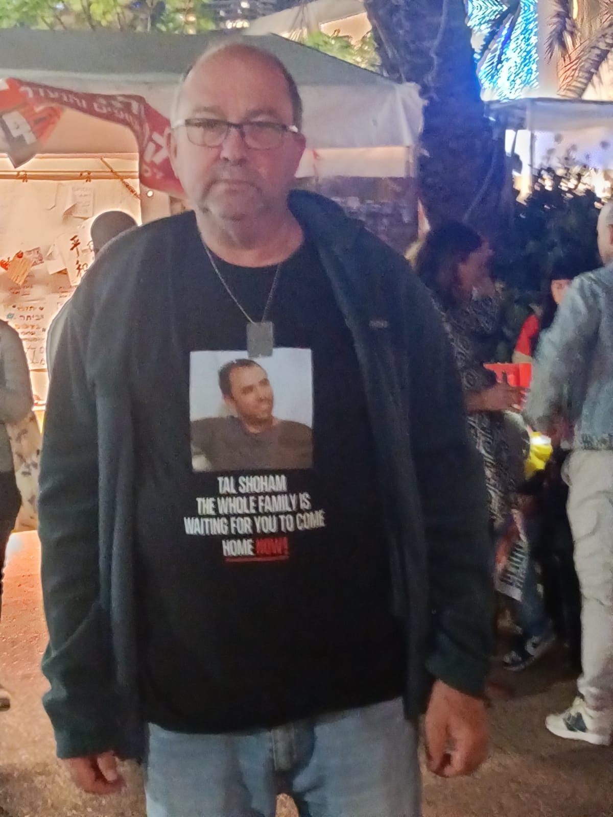 Gilad, a towering and robust figure, exudes a stoic demeanor. Clad in jeans and a t-shirt adorned with his son's picture, the weight of the message becomes palpable. Beneath the image, the poignant words "The whole family is waiting for you to come home" serve as a stark reminder of the profound pain etched on this man's heart.